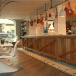 With a hexagonal mosaic floor tile in white and a black ‘rosette’ detail running in front of the bar and kitchen area.